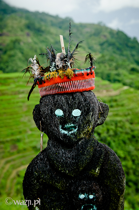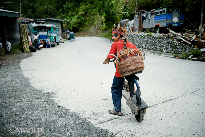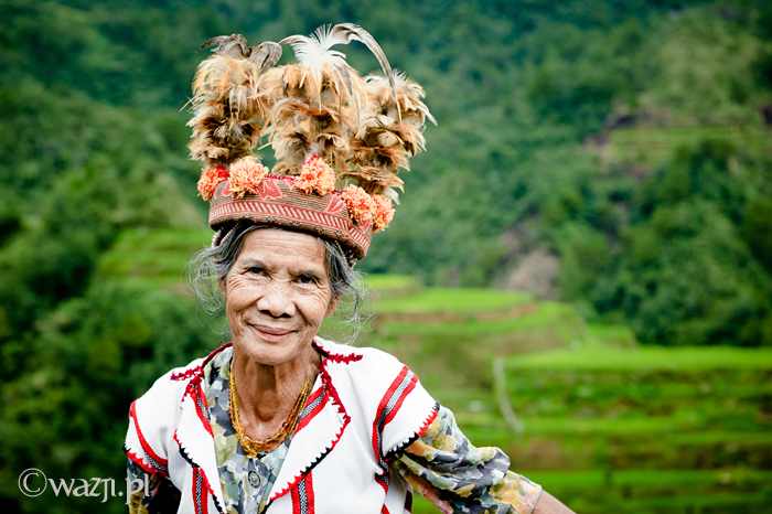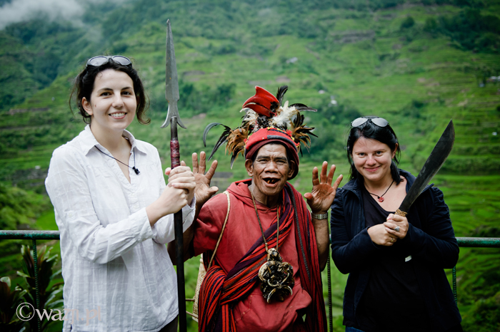 Ten nadchodzi następnego dnia i to wówczas nie tylko podziwiamy uroki Banaue, ale też raz jeszcze widzimy imponujące tarasy ryżowe położone nieopodal. Te liczące sobie ponad 2000 lat ryżowe pola położone są na wysokości ok. 1500 metrów n.p.m. i nawadniane przy pomocy misternych systemów irygacyjnych wykorzystujących wodę z położonych wyżej lasów deszczowych, ale niestety z roku na rok coraz więcej poletek ulega zniszczeniu – odwrotnie proporcjonalnie do ilości ludzi zainteresowanych uprawą roli i preferujących łatwiejsze zarobki w turystyce. Turystów jest faktycznie sporo i to z myślą o nich przy drodze z Banaue do Bontoc co kawałek zorganizowano punkty widokowe, przy których oprócz podziwiania pocztówkowych widoków można też zakupić pamiątki w którymś z licznych sklepów albo zrobić zdjęcie pana lub pani Ifugao w tradycyjnym plemiennym stroju. W ten sposób również i my spotykamy lekko przygarbioną panią w średnim wieku, wesołego pana na drewnianym rowerku, a także pana z uroczymi brakami w uzębieniu, który na nasz widok zawraca przyspieszając kroku. Każdy z nich zachowuje się jak prawdziwie profesjonalny model z wszystkimi tego konsekwencjami.