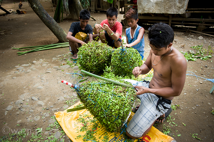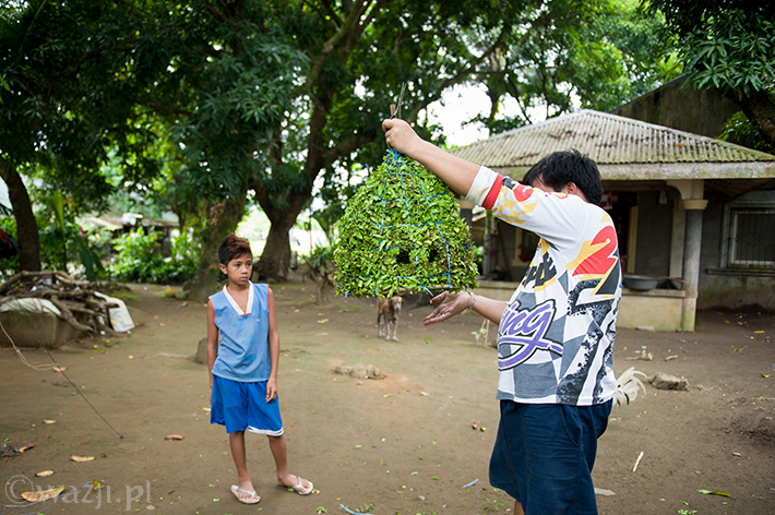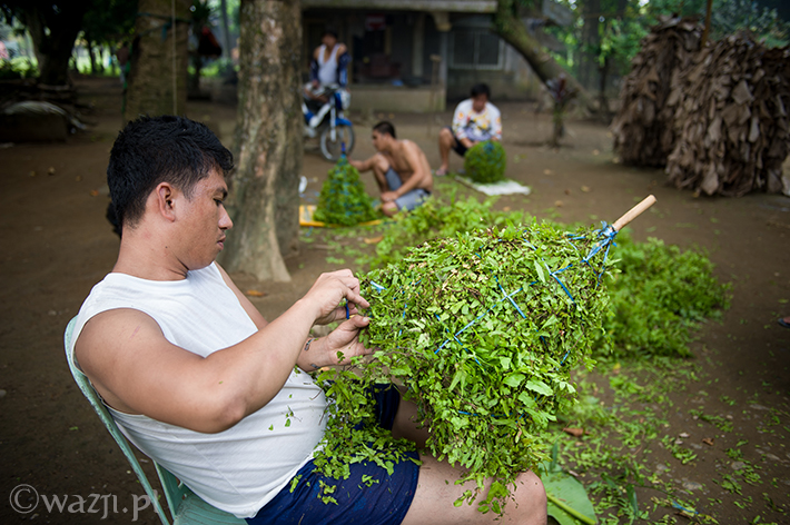 – Do przygotowania tukarola potrzeba dużo liści. Musi ich wystarczyć do tego, żeby zakryć cały bambusowy stelaż. – tłumaczy Mandy. – Kiedy już liście są odpowiednio umocowane, należy je przyciąć w kształt stożka. A potem ozdabia się wszystko kwiatami wedle własnych upodobań.