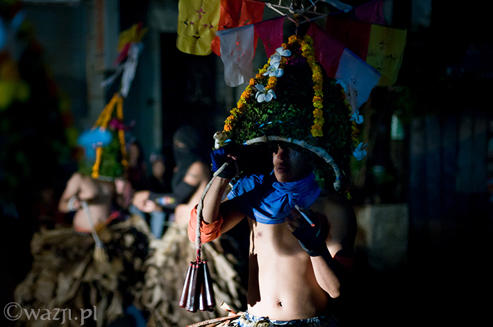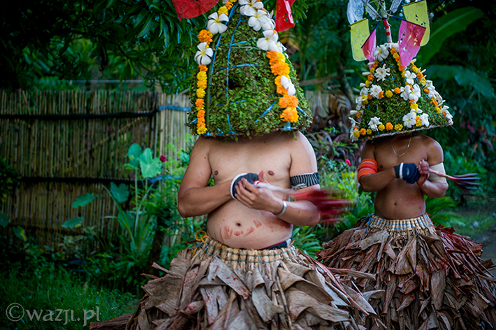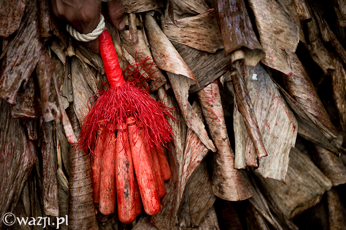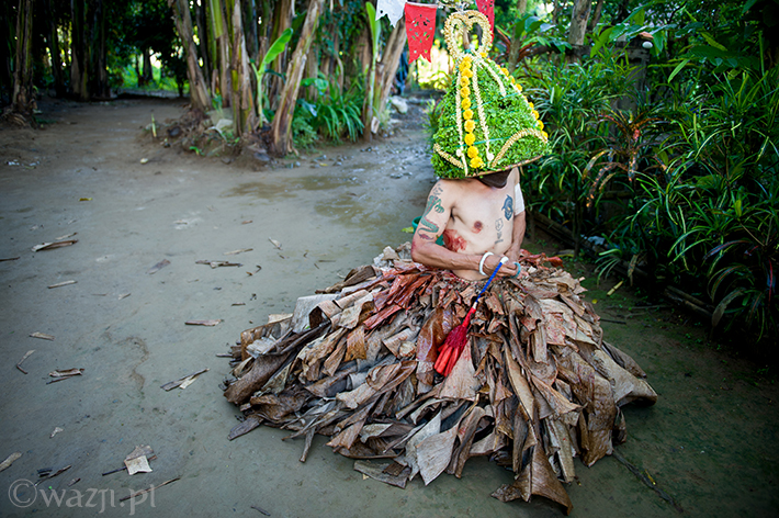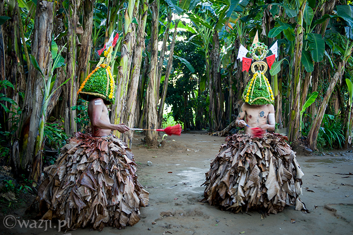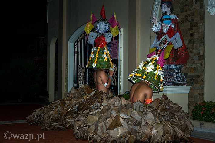Lambanog, czyli wino kokosowe, chyba faktycznie chłopakom pomaga. Śmieją się, żartują, co jakiś czas zanurzając bicze w wodzie, a w przerwach na kolejne papierosy oddając je w ręce znajomych. Potem zakładają bananowe spódnice i stożkowe maski. O trzeciej w nocy są gotowi do drogi.