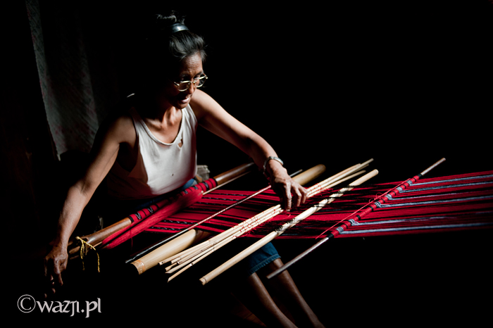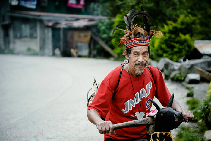 Ten nadchodzi następnego dnia i to wówczas nie tylko podziwiamy uroki Banaue, ale też raz jeszcze widzimy imponujące tarasy ryżowe położone nieopodal. Te liczące sobie ponad 2000 lat ryżowe pola położone są na wysokości ok. 1500 metrów n.p.m. i nawadniane przy pomocy misternych systemów irygacyjnych wykorzystujących wodę z położonych wyżej lasów deszczowych, ale niestety z roku na rok coraz więcej poletek ulega zniszczeniu – odwrotnie proporcjonalnie do ilości ludzi zainteresowanych uprawą roli i preferujących łatwiejsze zarobki w turystyce. Turystów jest faktycznie sporo i to z myślą o nich przy drodze z Banaue do Bontoc co kawałek zorganizowano punkty widokowe, przy których oprócz podziwiania pocztówkowych widoków można też zakupić pamiątki w którymś z licznych sklepów albo zrobić zdjęcie pana lub pani Ifugao w tradycyjnym plemiennym stroju. W ten sposób również i my spotykamy lekko przygarbioną panią w średnim wieku, wesołego pana na drewnianym rowerku, a także pana z uroczymi brakami w uzębieniu, który na nasz widok zawraca przyspieszając kroku. Każdy z nich zachowuje się jak prawdziwie profesjonalny model z wszystkimi tego konsekwencjami.