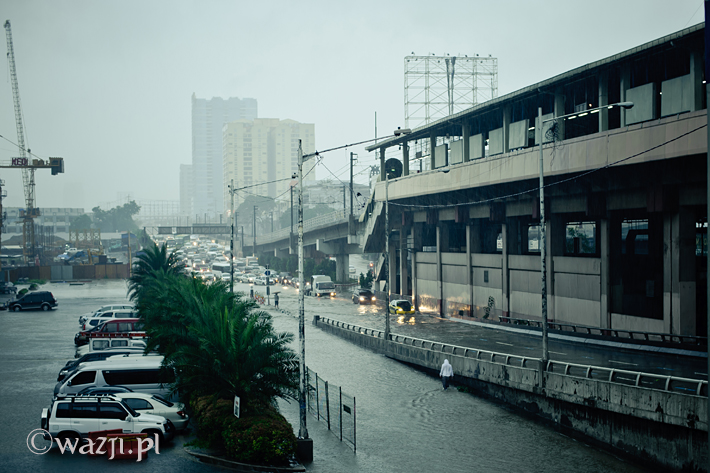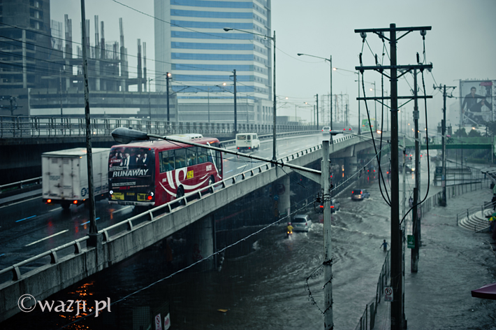 - EDSA w Ouezon City. Samochody w zalanej części drogi.