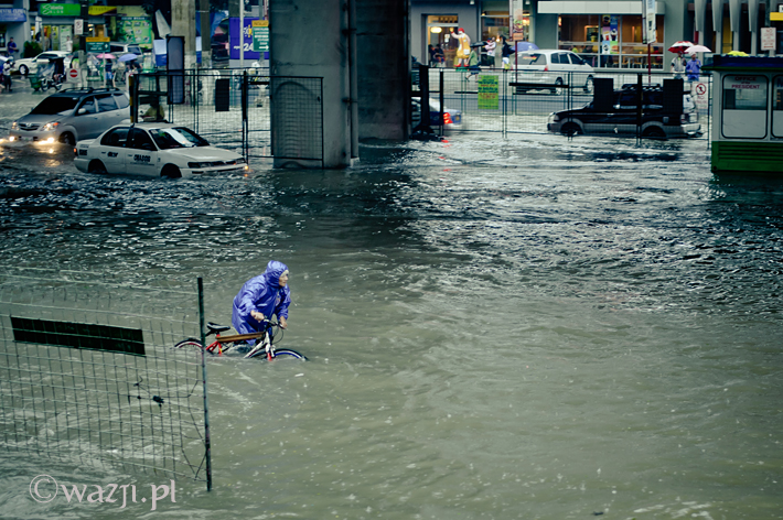 Nieco gorzej wygląda sytuacja wzdłuż kolejki LRT, bo tam praktycznie prawie cały czas z okien pociągu widać ulice, na których woda sięga przynajmniej do kolan. Ubrani w kalosze wyszliśmy na zewnątrz na kilku przystankach i całe szczęście, że nie wybraliśmy się w sandałach, bo często nie było możliwości opuszczenia stacji suchą stopą. Ale to nie tak, że stacji opuścić się nie da, bo wokół nich naprędce zorganizowano małe firmy przewozowe składające się z rykszy i kilku osób (jedna osoba pedałuje, pozostałe osoby pchają), a tam, gdzie woda sięgnęła prawie pasa, wprowadzono nawet pewne udogodnienia dla pasażerów w postaci modyfikacji rykszy polegających na przystosowaniu ich do transportu ludzi na desce umocowanej na dachu rykszy. Okazuje się więc, że wszystko da się zrobić.