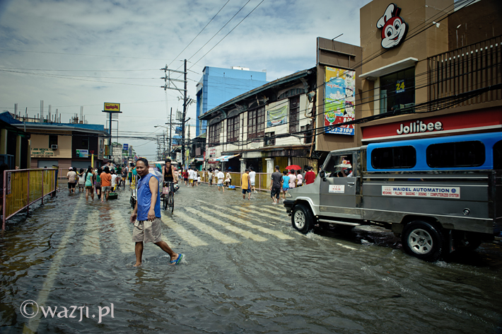 W Malabon, gdzie pojechałyśmy potem, sytuacja wygląda jeszcze lepiej. Na jednej z głównych ulic miasta wiodącej do miejskiego ratusza, woda co prawda ciągle jeszcze sięga prawie kolan, ale nikt się tym specjalnie nie przejmuje, a sama ulica zmieniła się w promenadę i plac zabaw dla dzieci. Otwarte są sklepy, banki, działa transport. Życie wraca do normy.