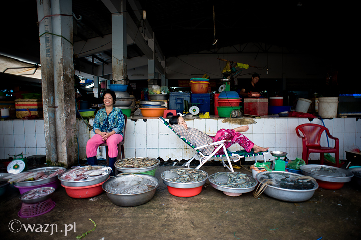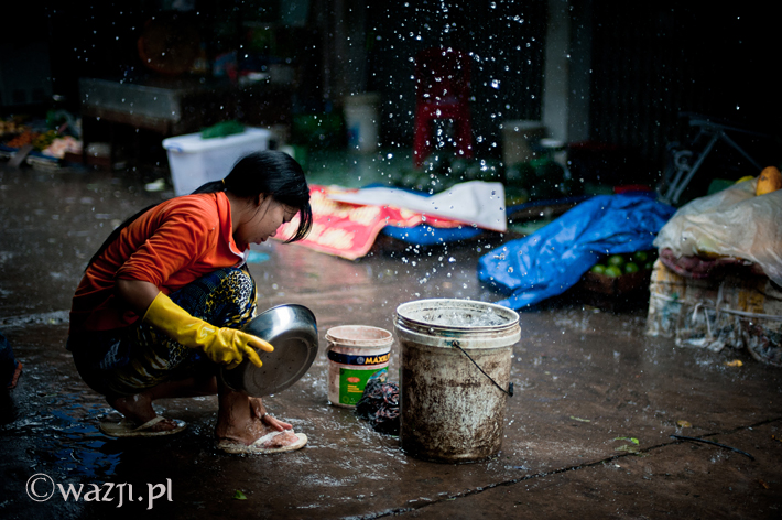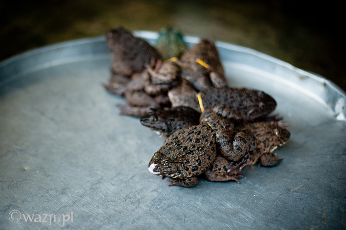 Mijaliśmy piękne kolonialne budynki i takie, które bardziej przypominały slumsy, aż w końcu trafiliśmy na targ. Taki zwykły, lokalny („Tu chyba nie było żadnego turysty” – reklamował miejsce Qui), na którym sprzedawano wszystko, włącznie z żywymi żabami powiązanymi w pary w ramach sekcji „wet marketu”. I właśnie, obok tych żab zeskakujących w popłochu przede mną z miski, złapał mnie ulewny deszcz, który zatrzymał mnie przed jednym ze straganów na dobrą godzinę i pozwolił przejrzeć się, jak życie wokół najpierw zwolniło, a potem zupełnie zamarło. Przygotowano hamaki, wyjęto gry planszowe i tylko kilkuletnia dziewczynka w kwiecistej niebieskiej sukience miała tę nadwyżkę energii, która pozwoliła jej skakać po coraz liczniejszych kałużach.