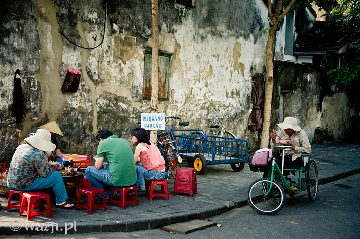 Zza rogu powłócząc nieco nogami wyłania się starsza koścista pani dźwigając na swych barkach dwa duże kosze pełne jedzenia i kilka małych stołeczków. Przystaje przy jednej z żółtych ścian, lekko dysząc z przemęczenia, ale już po chwili wszystko rozpakowuje i w ten sposób na jednym z chodników rozpoczyna działalność mini-knajpka uliczna serwująca Cao lầu, lokalny specjał.