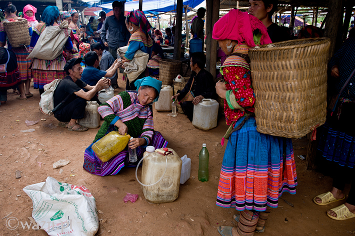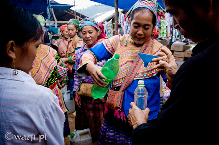 Dla mnie prawdziwym rarytasem (choć nie dosłownie rarytasem) był targ bydła, który na położonym nieopodal wzgórzu zgromadził licznych sprzedawców bawołów zachwalających swoje okazy przed poważnymi kupcami i całą masą gapiów, ale i tak największą popularnością w Coc Ly cieszył się ten rejon targowiska, w którym skupili się sprzedawcy ryżowego wina znanego tam jako „radosna woda” (ang. happy water), rzekomo dla swoich właściwości nie przyczyniających się do powstania kaca niezależnie od wypitych ilości alkoholu. Nie sprawdzałam, ile w tym prawdy, ale być może coś w tym jest, skoro w oparach i przy kieliszkach mocnego trunku spędzali całe godziny nie tylko panowie, ale również panie.