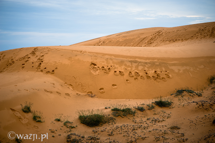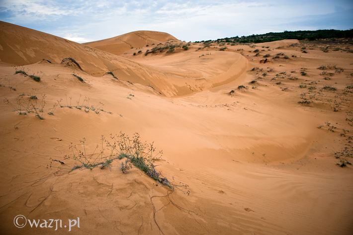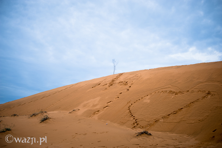 Spacery po piasku tu już raczej domena Wydmy Żółtej położonej rzut beretem od wioski Mui Ne. Turystów tam całe mnóstwo, więc skutkuje to tym, że wydma jest skutecznie zadeptywana od rana do wieczora, choć na szczęście schodząc z „głównego szlaku” można znaleźć prawie że dziewicze piaszczyste zakątki. Również na Wydmie Żółtej przygotowano dla turystów atrakcje: dla odmiany od dreptania po wydmie, mogą wyszaleć się zjeżdżając z okolicznych górek na płachtach do ślizgania. Nie mam zielonego pojęcia, z czego je wykonano (płachty, nie górki), wiem, że cieszą się całkiem dużym wzięciem.