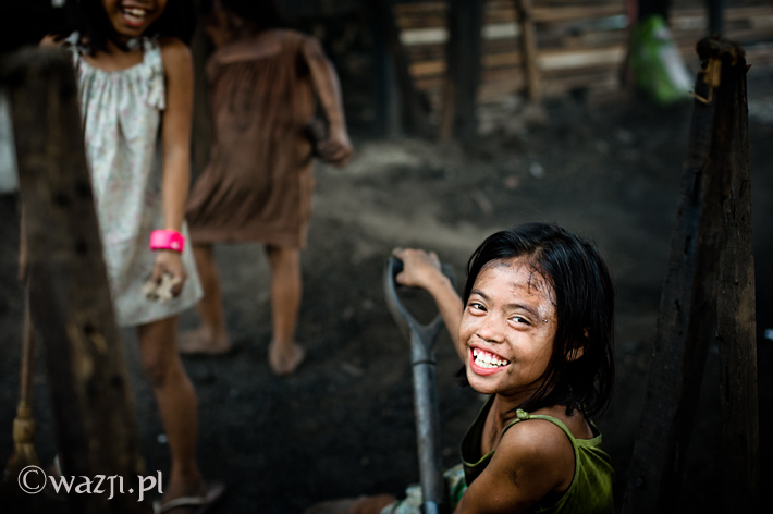 Proces spalania zebranych kawałków drewna zajmuje zwykle około trzech dni. W tym czasie należy przykryć je warstwą blachy i nawilżonej ziemi i cierpliwie czekać, aż zmieni się w upragniony węgiel drzewny, który następnie delikatnie zebrany do worków zostanie sprzedany w punkcie skupu, a stamtąd trafi do rąk, a właściwie na grille ulicznych sprzedawców i do domów mieszkańców Manili. W fabryce trzy kilkuletnie dziewczynki w kusych sukienkach na boso lub w klapkach pracują przy separowaniu węgla drzewnego. Na nasz widok zaczynają robić mniej i bardziej głupie miny, co na ich uczernionych twarzach pokrytych warstwą węgla i potu wygląda szczególnie makabrycznie. To jedne z tych dzieci, które pomagają rodzicom zarobić na utrzymanie. I to jedna z ich nielicznych chwil radości, bo kiedy wracają do pracy, ich poważne twarze niczym nie różnią się od twarzy dorosłych.