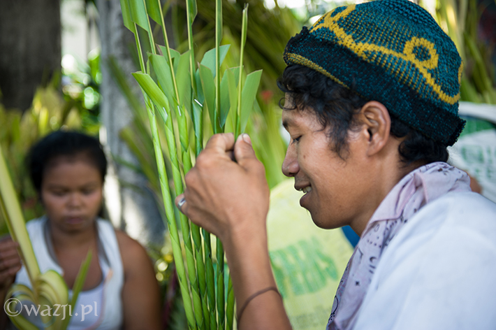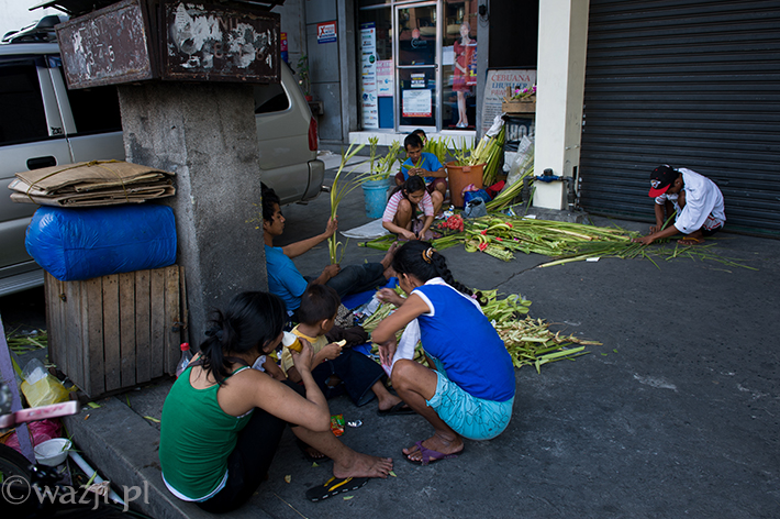 Choć tak naprawdę wszystko zaczyna się dzień wcześniej – już w sobotę. A przynajmniej wtedy właśnie zaczyna się praca przy wyrobie palm z liści drzew kokosowych. Jak to zwykle bywa, przydaje się każda para rąk – tych młodszych, najczęściej wykorzystywanych do sprzedaży palmowych majstersztyków (po 20 peso za sztukę), jak i starszych, bardziej doświadczonych w zaplataniu palmowych wzorów. Pracują całe rodziny, uprzednio przygotowawszy sobie stoisko-domek, aby przed wybranym kościołem móc spędzić odpowiednią ilość czasu i zająć strategiczną pozycję na niedzielę.