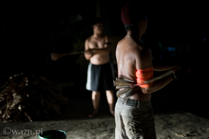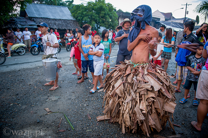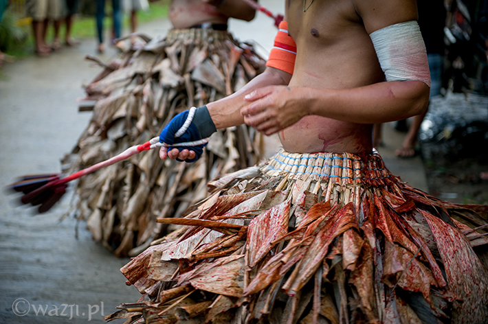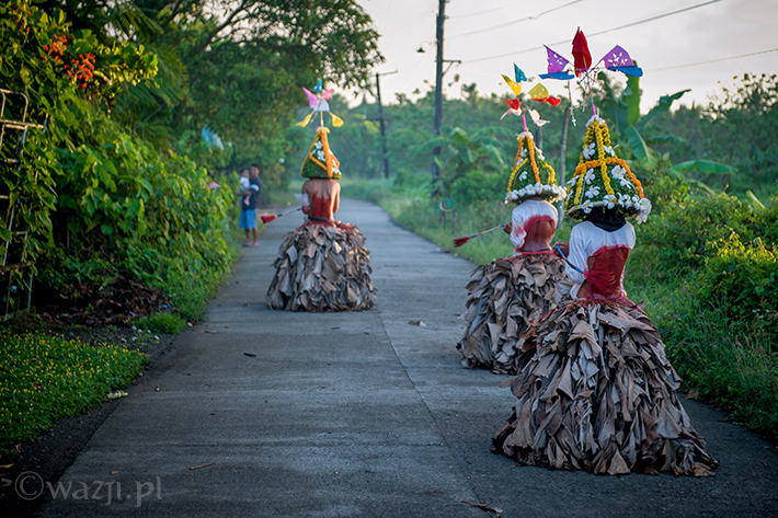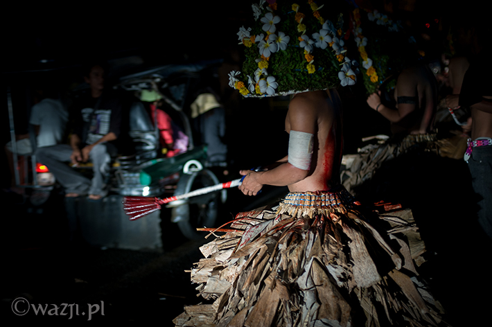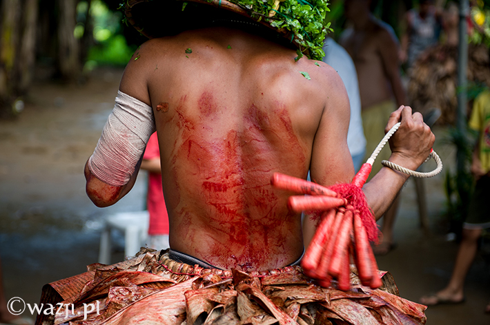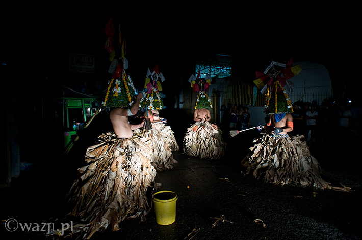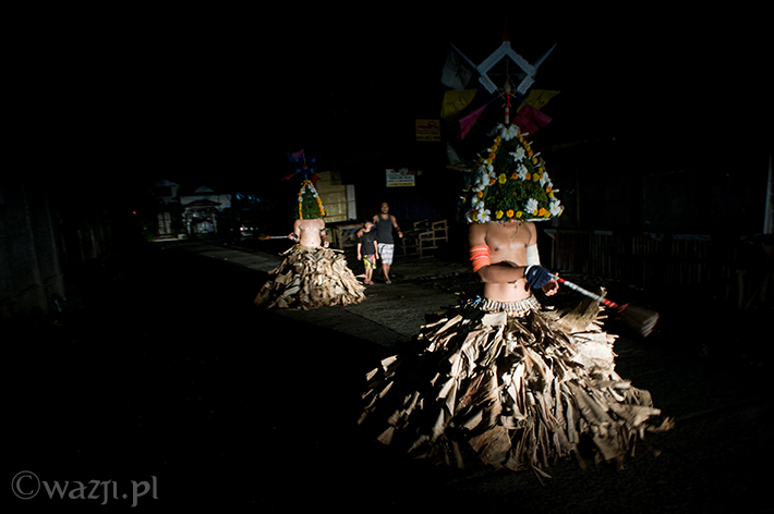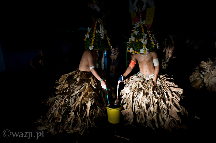 Lambanog, czyli wino kokosowe, chyba faktycznie chłopakom pomaga. Śmieją się, żartują, co jakiś czas zanurzając bicze w wodzie, a w przerwach na kolejne papierosy oddając je w ręce znajomych. Potem zakładają bananowe spódnice i stożkowe maski. O trzeciej w nocy są gotowi do drogi.