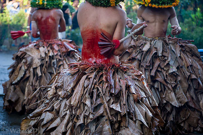 Kiedy promienie wschodzącego słońca rozświetlają okolicę, biczownicy są już na lokalnej drodze, a ich okrwawione plecy i bananowe spódnice kontrastują z soczystą zielenią okolicznych pól ryżowych. Są kolejne razy i kolejne nacięcia. Krew spływa na zaparkowane samochody i stopy gapiów.