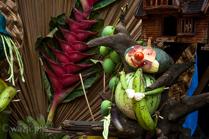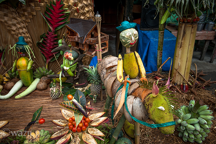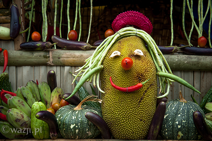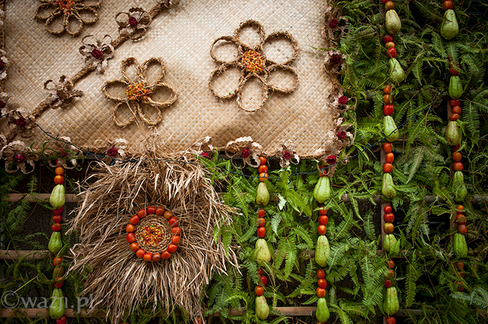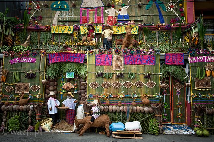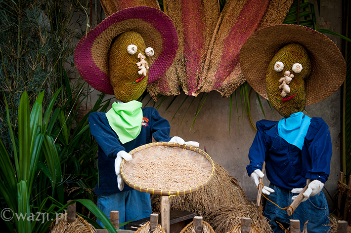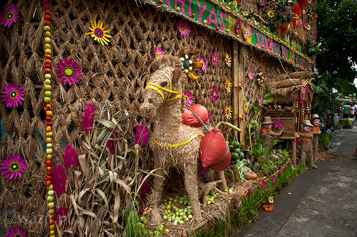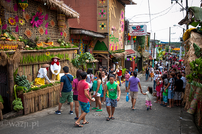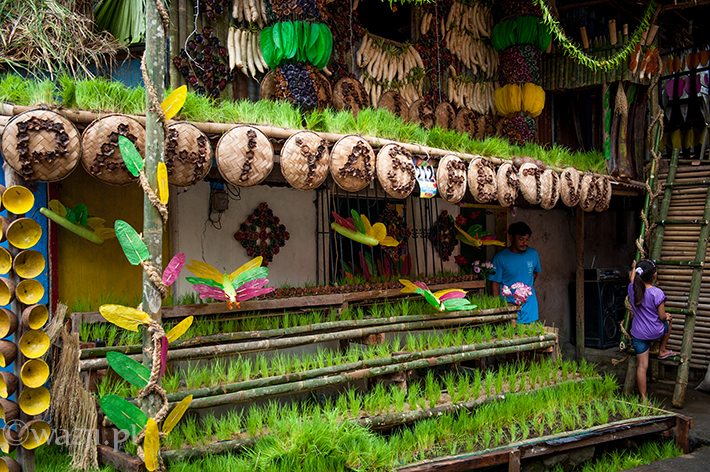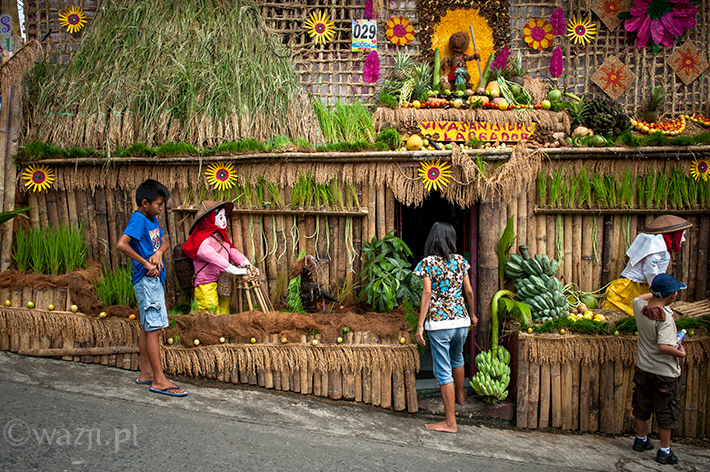 I czego my tam nie mamy? Są motyle z bakłażana, uśmiechnięte jackfruity z fasolowymi włosami, robot z czuprynką z okry, (to mój zdecydowany faworyt!) wierzchowce z kokosowych skorupek, a nawet tarasy ryżowe. Nagroda za najatrakcyjniejszą dekorację jest niebagatelna (100 tys. peso = 7,8 tys pln), zatem większość mieszkańców wkłada w tę całą imprezę sporo wysiłku. W ubiegłą środę na „festiwalowych” ulicach przystrojone były faktycznie wszystkie domy i do dziś nurtuje mnie pytanie, na ile dekorowanie domów jest przyjemnością i chęcią uczestnictwa w dorocznej zabawie, a na ile wynika z powinności wobec miasta (pytaliśmy i zostaliśmy bez odpowiedzi, bo to pytanie każdy zwyczajnie ignorował).