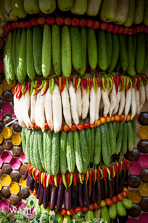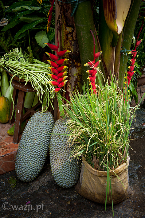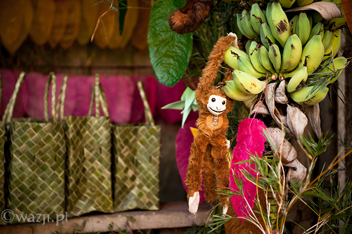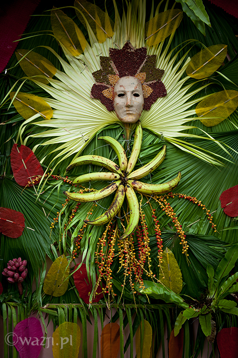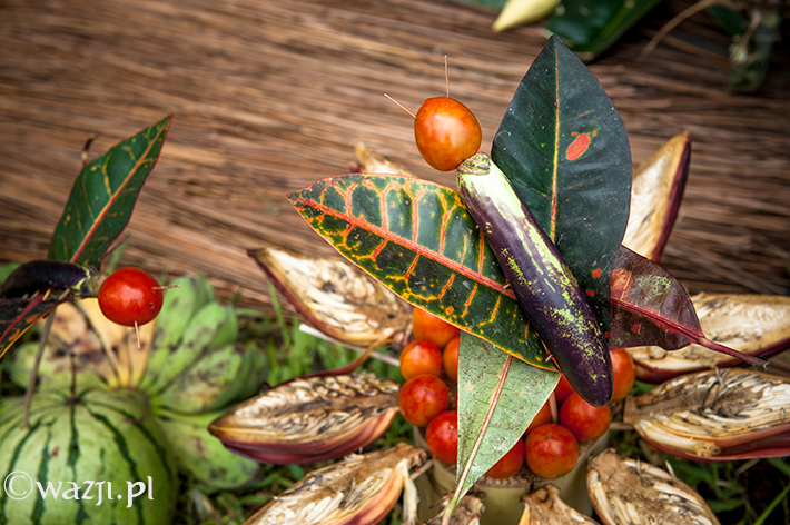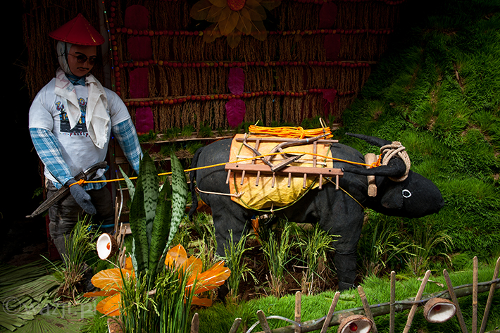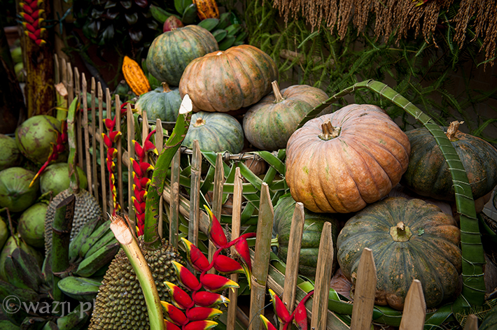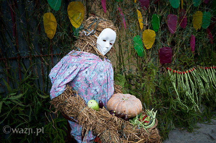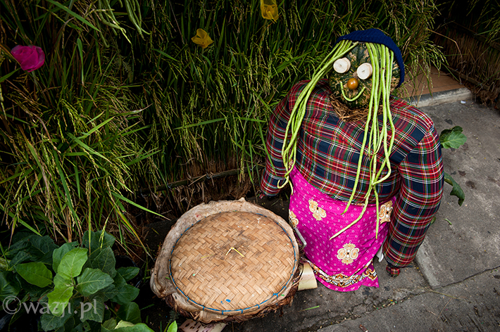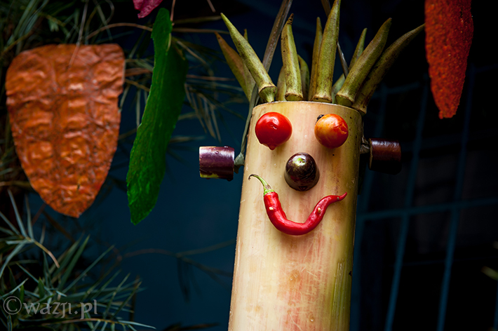 I czego my tam nie mamy? Są motyle z bakłażana, uśmiechnięte jackfruity z fasolowymi włosami, robot z czuprynką z okry, (to mój zdecydowany faworyt!) wierzchowce z kokosowych skorupek, a nawet tarasy ryżowe. Nagroda za najatrakcyjniejszą dekorację jest niebagatelna (100 tys. peso = 7,8 tys pln), zatem większość mieszkańców wkłada w tę całą imprezę sporo wysiłku. W ubiegłą środę na „festiwalowych” ulicach przystrojone były faktycznie wszystkie domy i do dziś nurtuje mnie pytanie, na ile dekorowanie domów jest przyjemnością i chęcią uczestnictwa w dorocznej zabawie, a na ile wynika z powinności wobec miasta (pytaliśmy i zostaliśmy bez odpowiedzi, bo to pytanie każdy zwyczajnie ignorował).