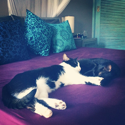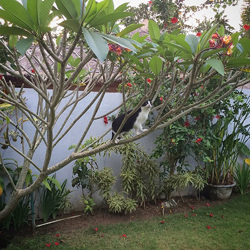 Koty głównie śpią, a kiedy nie śpią, to na zmianę polują i walczą. Polują przede wszystkim na jaszczurki i gołębio-kuropatwy, ale wczoraj Miszce udało się też upolować balijskiego wróbla, co zresztą zakończyło się wspólną kąpielą kota i ptaka w basenie. Misza wyszła z wody sama, ale wróbla musiałam ratować. Walczą z białym kocurem od sąsiadów, który nie odpuszcza i od czasu do czasu nawiedza nasz ogród. Bywa głośno, walecznie, a czasem również nieco krwawo. Zapomniałabym napisać, że kot Leot w międzyczasie nauczył się sztuki łażenia po drzewach. Mamy nadzieję, że nie zagustuje we wspinaczce po palmie, bo wówczas przyjdzie nam sprawdzić, jak funkcjonuje balijska straż pożarna.