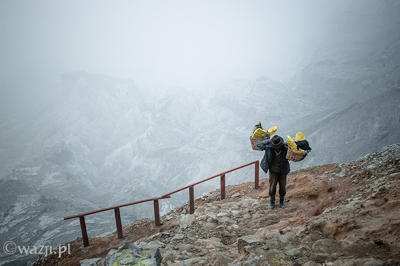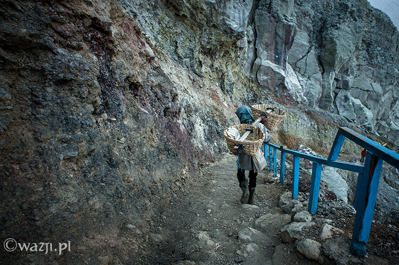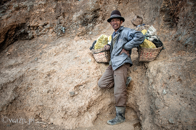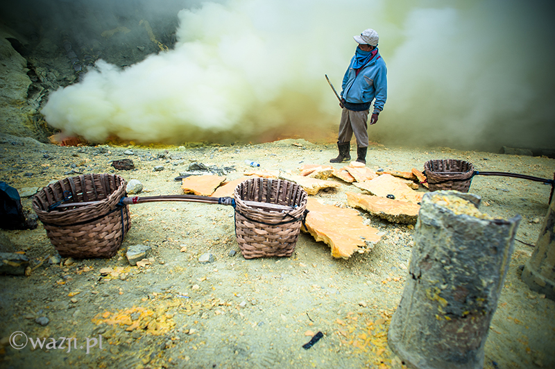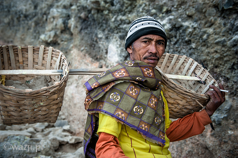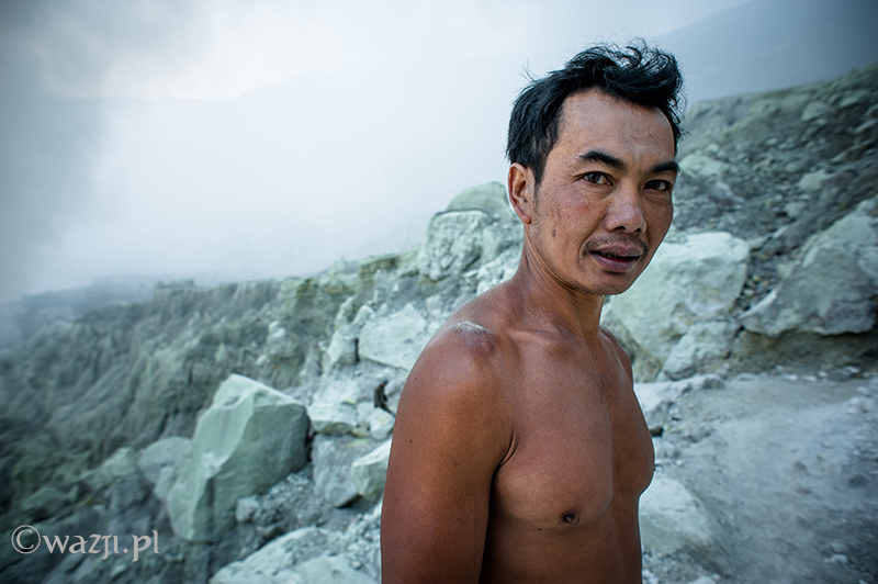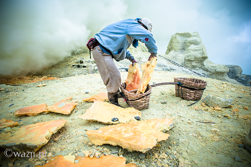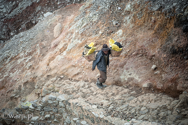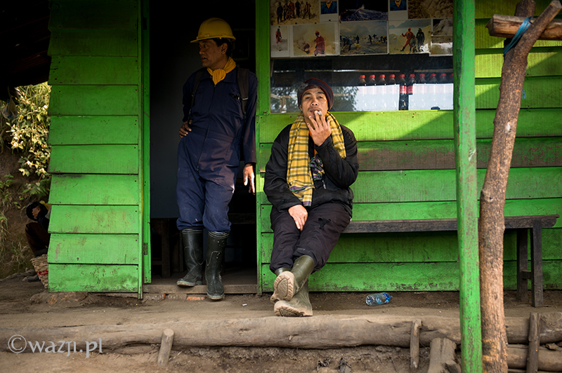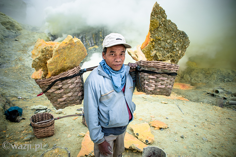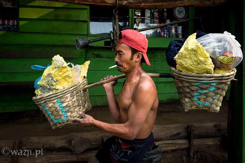Kawah Ijen to jednak nie tylko wulkan wysoki na prawie 2800 metrów, ale przede wszystkim wielka kopalnia siarki, w której obecnie pracuje około 70 górników. Tych bohaterskich indonezyjskich herkulesów dostrzegam jeszcze przed świtem. Właśnie kruszą żołtą siarkę i upychają w swych koszach jej ciężkie kawały, aby potem mozolnie wynieść je na powierzchnię. Sami będąc parszywego wzrostu dzielnie dźwigają około 70 kilogramowe kosze, przystając tylko na chwilę i zapalając papierosa. Prawie codziennie, czasem przez dziesiątki lat, a przynajmniej tak długo, jak długo zdrowia wystarczy. Przynosząc do skupu dwa razy po dwa 70-80 kg zarabiają 1000 indonezyjskich rupii za każdy wniesiony kilogram. Łatwo obliczyć, że ich dzienna stawka wyniesie wówczas średnio 140-160 tys. rupii (38-43 zł), co może nie należy do zupełnie najniższych zarobków w Indonezji, ale z pewnością to zwyczajnie marne pieniądze biorąc pod uwagę włożony wysiłek i uszczerbek na zdrowiu. Bo zakładam, że o braku ubezpieczenia i opieki zdrowotnej wspominać nie muszę.