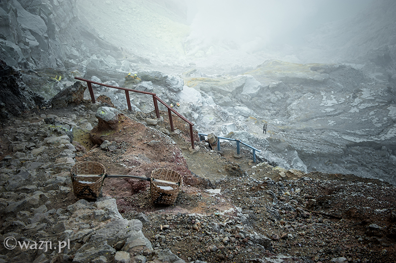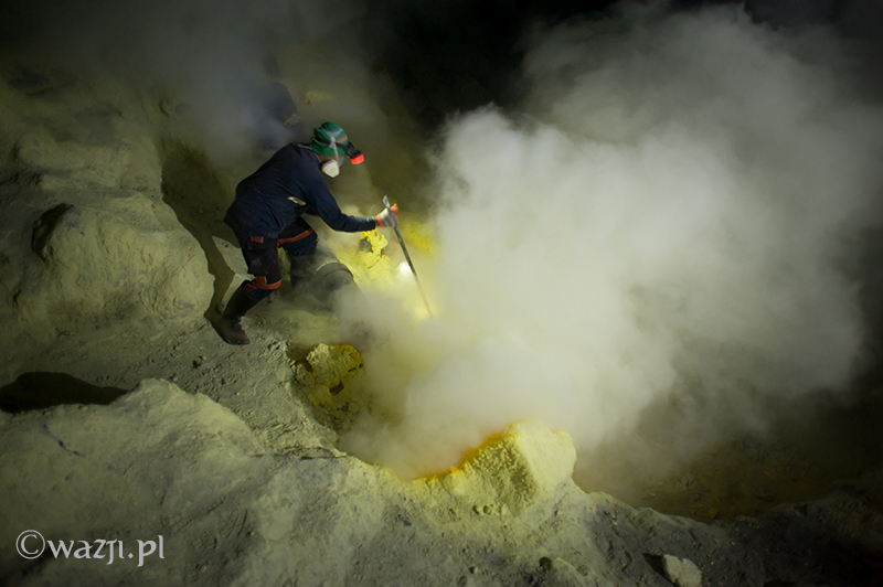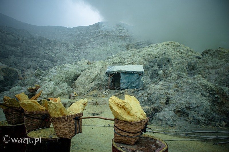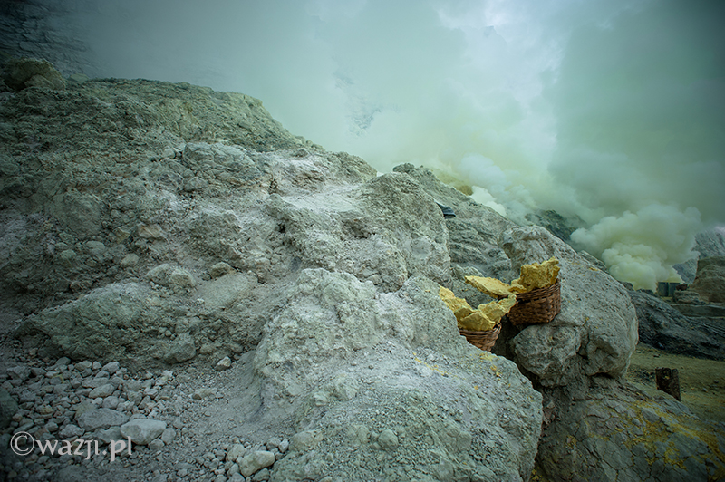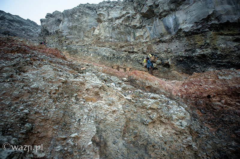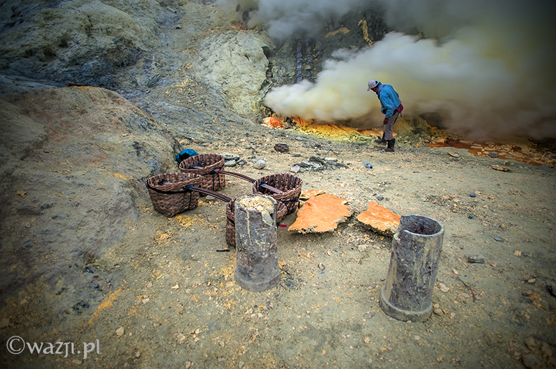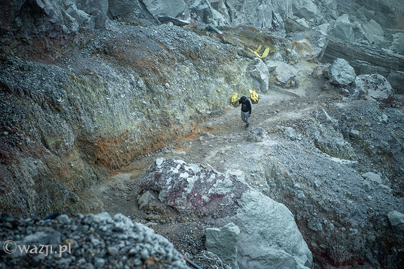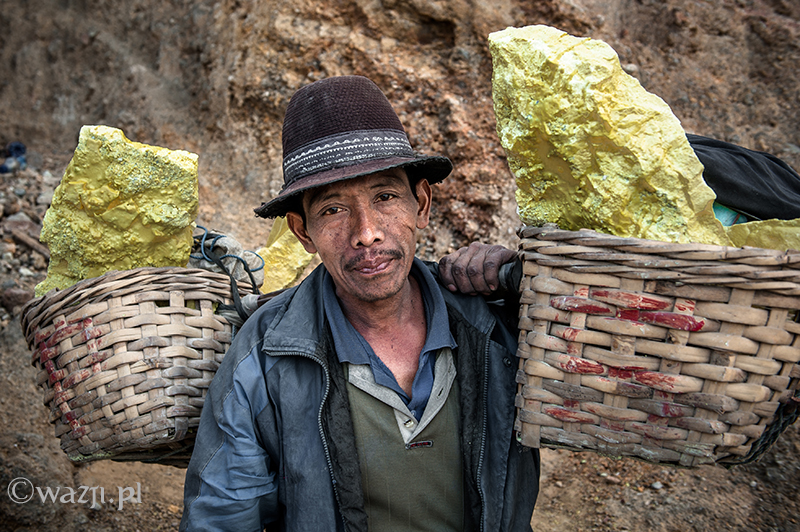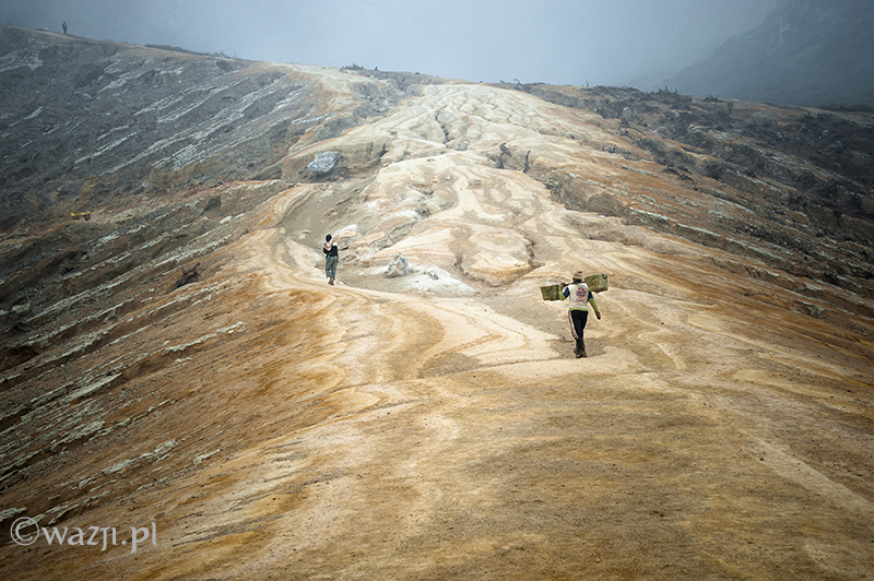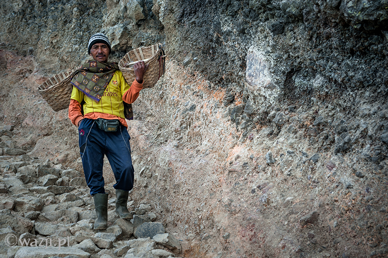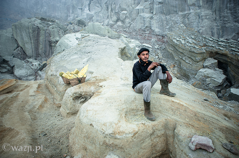 Kawah Ijen to jednak nie tylko wulkan wysoki na prawie 2800 metrów, ale przede wszystkim wielka kopalnia siarki, w której obecnie pracuje około 70 górników. Tych bohaterskich indonezyjskich herkulesów dostrzegam jeszcze przed świtem. Właśnie kruszą żołtą siarkę i upychają w swych koszach jej ciężkie kawały, aby potem mozolnie wynieść je na powierzchnię. Sami będąc parszywego wzrostu dzielnie dźwigają około 70 kilogramowe kosze, przystając tylko na chwilę i zapalając papierosa. Prawie codziennie, czasem przez dziesiątki lat, a przynajmniej tak długo, jak długo zdrowia wystarczy. Przynosząc do skupu dwa razy po dwa 70-80 kg zarabiają 1000 indonezyjskich rupii za każdy wniesiony kilogram. Łatwo obliczyć, że ich dzienna stawka wyniesie wówczas średnio 140-160 tys. rupii (38-43 zł), co może nie należy do zupełnie najniższych zarobków w Indonezji, ale z pewnością to zwyczajnie marne pieniądze biorąc pod uwagę włożony wysiłek i uszczerbek na zdrowiu. Bo zakładam, że o braku ubezpieczenia i opieki zdrowotnej wspominać nie muszę.