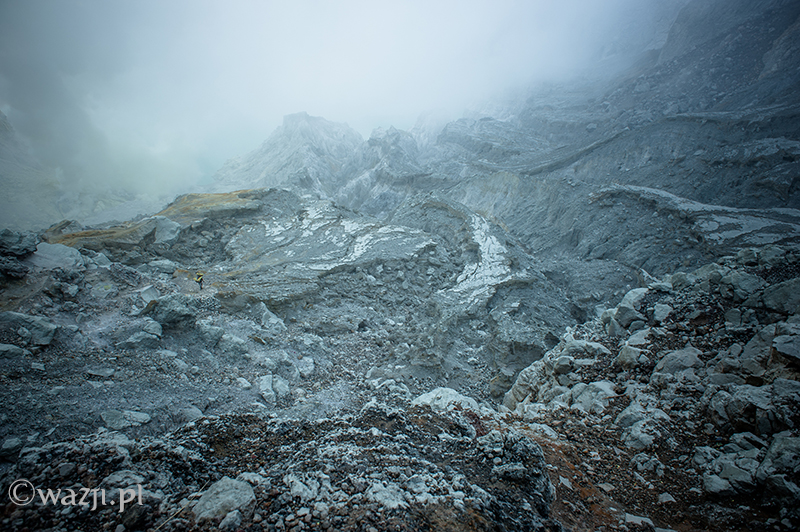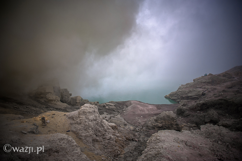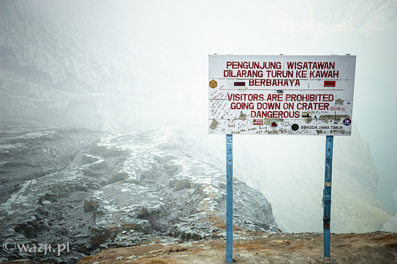 Na górze kaldery jesteśmy szybciej niż można byłoby przypuszczać. Stojąc przy tablicy z ostrzeżeniem o niebezpieczeństwie (nazwijmy rzecz po imieniu: tablicy z zakazem zejścia w dół Kawah Ijen) sprawdzamy warunki panujące w kraterze. Chyba nie jest idealnie, bo nawet w ciemności można dostrzec, że trafiły nam się gęste chmury i sporo siarkowego dymu. Ale, podobnie jak i inni, ruszamy stromą i kamienistą ścieżką w dół. Nadal jest ciemno i mrok rozjaśniają jedynie skąpe światła czołowych latarek licznych turystów. Nie wiem, ile dokładnie czasu mija (droga ma zająć podobno 45 minut), ale w końcu jesteśmy na dole.