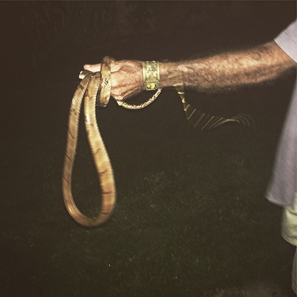 Peter, starszy brodaty jegomość, nonszalancko wkroczył przez bramę. Rozpięta koszula, sowicie zarośnięty tors, papieros w kąciku ust. W jednej ręce torba na węże, w drugiej przyrząd do ich podnoszenia. Wężem numer 4 zachwycił się niemal natychmiast („Bjutiful” – westchnął na jego widok). Równie szybko sklasyfikował go jako Dog Toothed Cat Snake (Boiga cynodon) – ok. 2 – metrowej długości, 10-15 letniego węża. Średnio jadowitego (czyli generalnie nieszkodliwego dla ludzi, ale już niekoniecznie dla kotów czy psów), ale kąszącego rzadko, a żywiącego się głównie jaszczurkami, ptakami i małymi ssakami. Prowadzącego nocny i nadrzewny tryb życia. Ocenił, że mógł trafić do nas z pobliskiej rzeki przełażąc z drzewa na drzewo, no a wczoraj miał biedaczysko pecha spadając wprost do naszego ogrodu. Ręka Petera to pewność, precyzja i spokój, więc w obecności profesjonalisty zrelaksował się zarówno wąż, jak i my, a nawet znalazła się chwila na zrobienie kilku zdjęć. A potem wąż trafił do worka, w którym zostanie przeniesiony w bardziej przychylne mu okoliczności przyrody. I tyle.