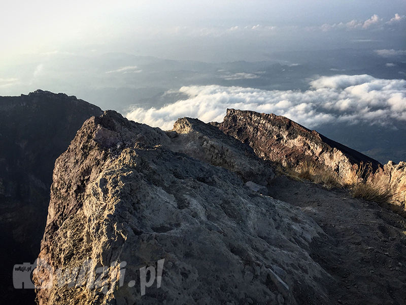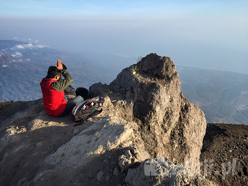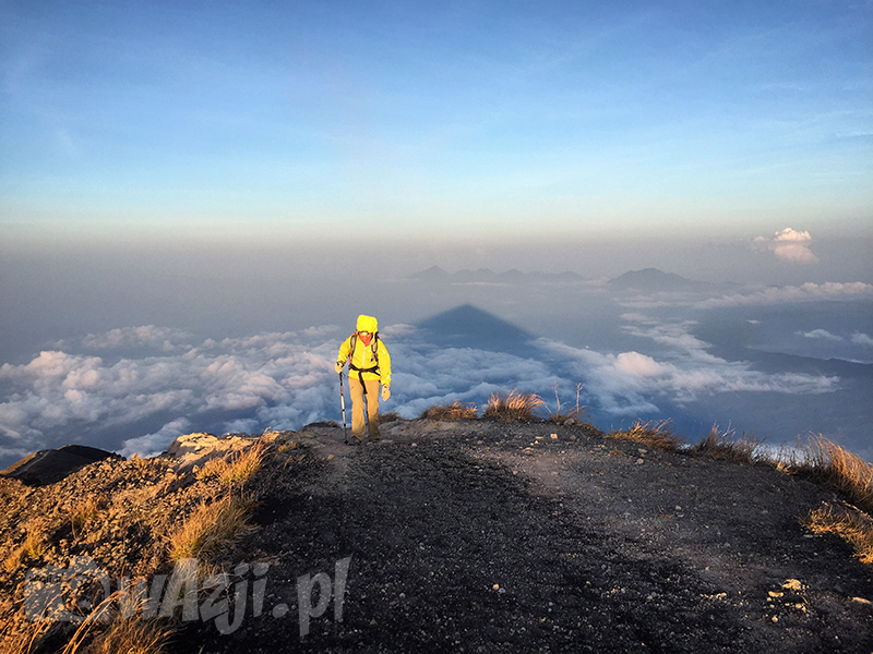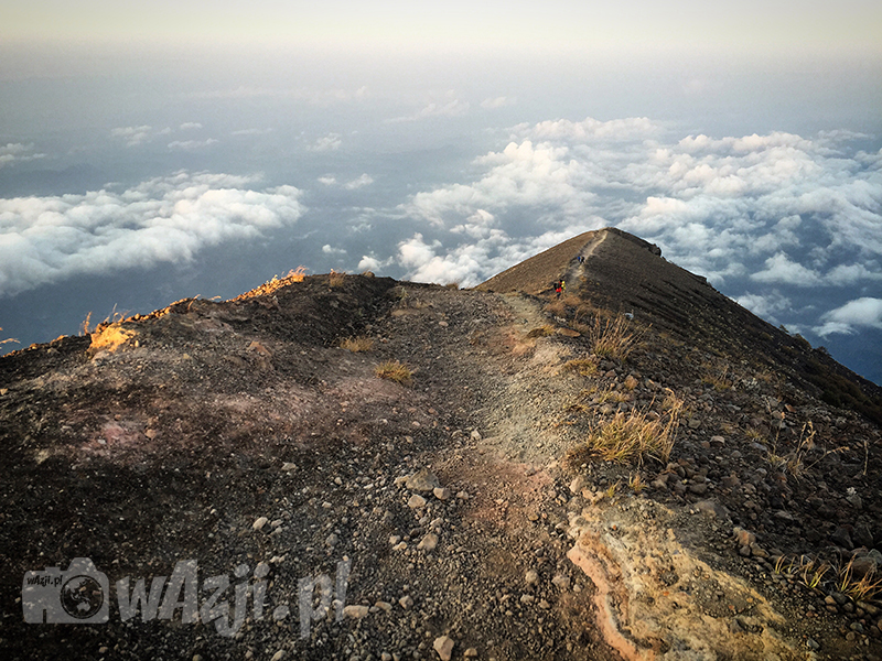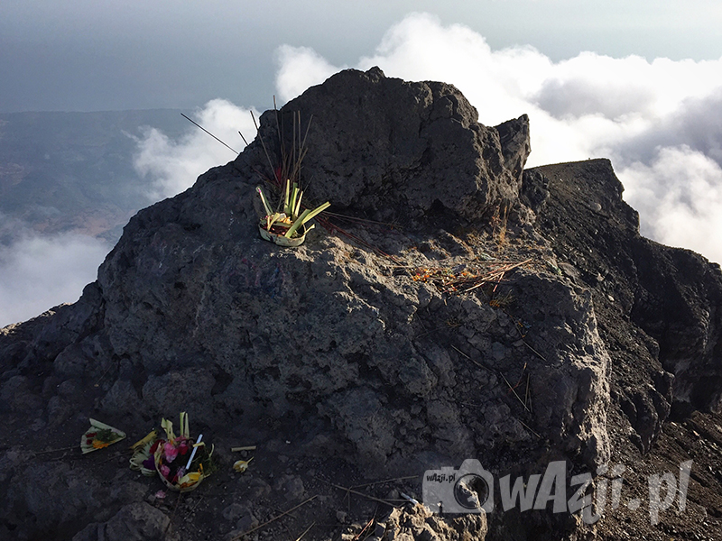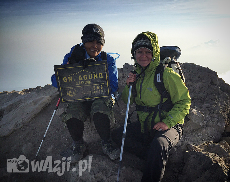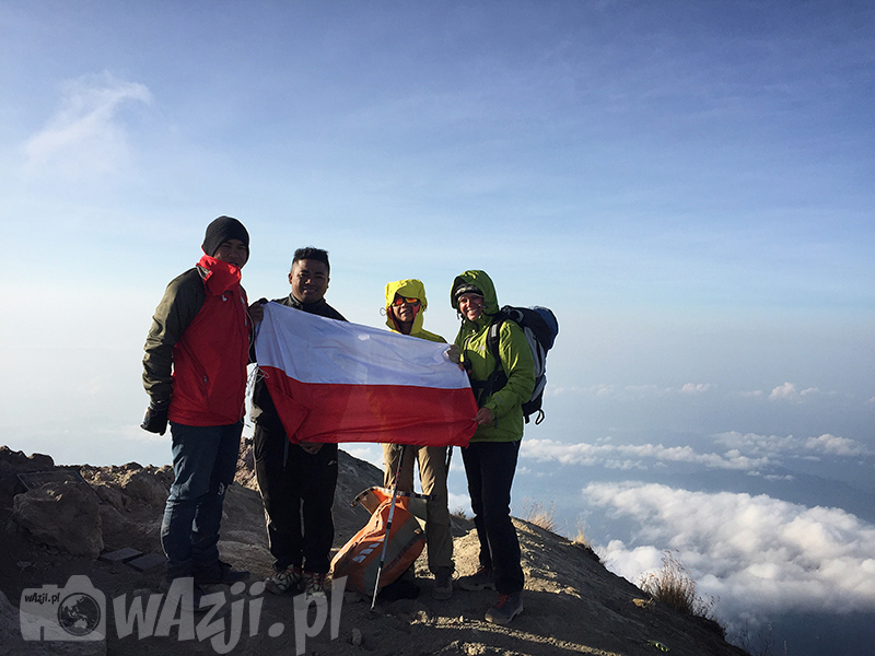 Suche wulkaniczne skały zastąpiły piaszczystą ścieżkę, a stromizny coraz częściej zaczęły absorbować wszystkie cztery kończyny, ale kiedy zobaczyłam kontury szczytu góry w powoli rozpraszającym mrok świetle nadchodzącego dnia, nabrałam energii i przyspieszyłam, aby jak najszybciej znaleźć się na górze. Tak, to właśnie wtedy zorientowałam się, że brakuje mi aparatu**. Na górze dął tak porywisty wiatr, że przejście stromego grzbietu górskiego prowadzącego do najwyższego punktu Agunga wydało mi się nieco niebezpieczne, ale zdecydowałam się podjąć ryzyko zakładając, że te obawy to raczej wybryki mojej wyobraźni pracującej ze zmęczenia na wysokich obrotach. Wtedy jeszcze nie wiedziałam, że zostaliśmy sami, bo przewodnik był gdzieś w dole z jednym z członków naszej ekipy nie decydującym się na wejście na sam szczyt. Może i dobrze, że tak się stało, bo kiedy usłyszał od schodzących już ludzi, jakie warunki panują na szczycie, pognał wręcz do góry, aby zmobilizować nas do jak najszybszego zejścia na dół. Ale to było potem. Najpierw została nas tylko piątka. Był czas na zdjęcia (flaga indonezyjska poudawała przez moment flagę polską) i niewielką ceremonię odprawioną na szczycie przez skostniałych Balijczyków, ale ani temperatury ani wiatr nie zachęcały do pozostania na górze dłużej.