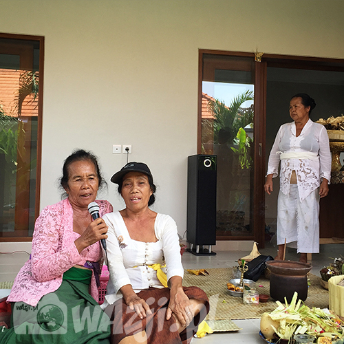 Na ceremonię w naszym domu znany w okolicy kapłan pembangku przybył o czasie zupełnie zaskakując zebrane i rozchichotane sąsiadki. Rozłożono dziesiątki koszyczków z ofiarkami, a większe dary umieszczono w strategicznych miejscach domu (np. w pokoju dziennym, kuchni, z przodu i tyłu domu oraz w gazebo). Zapalono kadzidła, przy dźwiękach kapłańskiego dzwonka odprawiono długotrwałe modły w sanskrycie, odśpiewano stosowne mantry (w wykonaniu lokalnych starszych śpiewaczek), pokropiono poświęconą wodą. Potem włączono mnie w krąg rodziny, kiedy kapłan udzielał błogosławieństw. A na koniec w długiej i energicznej procesji symbolicznie wykurzono demony.
