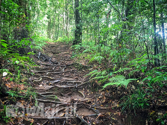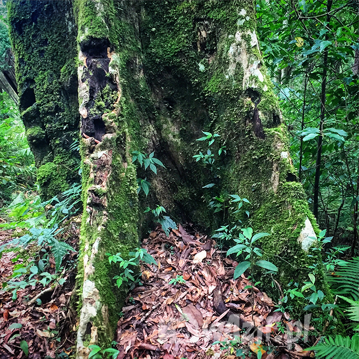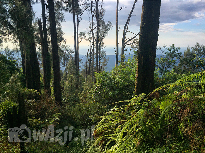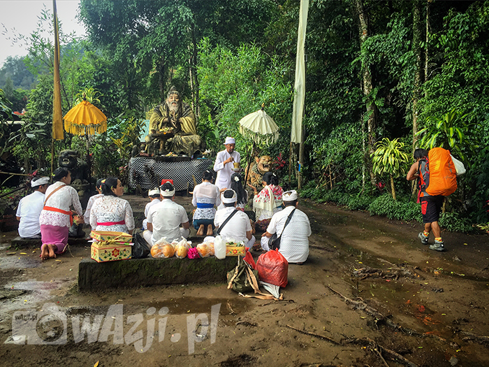 Lało tylko od czasu do czasu, więc tylko od czasu do czasu krople deszczu mieszały się z potem spływającym z czoła. Zabłocona, dość stroma i opleciona korzeniami drzew ścieżka prowadziła prosto w górę. Wokół siebie miałam bujną i wilgotną zieloność lasu deszczowego, obfitującą w omszałe krzaki, wielkie drzewa i oplatające je storczyki – podobno jeden z piękniejszych lasów na Bali. Nasza kilkunastoosobowa ekipa zupełnie się rozproszyła, więc szłam sobie w górę sama podziwiając otoczenie, słuchając śpiewu ptaków i od czasu do czasu mówiąc sobie “spokojnie, w końcu to nie pierwszy raz, kiedy zostajesz sama w indonezyjskiej dżungli”. Ścieżka pięła się coraz bardziej stromo. Co jakiś czas mijałam naturalne przeszkody w postaci drzew na drodze, ślizgałam się w błocie, klnęłam, odliczałam metry do szczytu i byłam do tego stopnia brudna, że obojętne stały mi się nawet potencjalne pijawki, których wcześniej obawiałam się najbardziej.